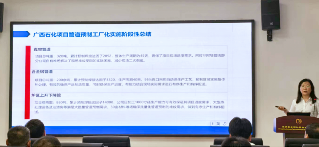 金童裝備公司常務(wù)副總兼總工程師韓越女士作“管道預(yù)制智能制造示范項目”的介紹及實施經(jīng)驗分享。管道預(yù)制工廠化模式是工廠化預(yù)制的延伸,預(yù)制工廠化實施的主體是專業(yè)化的制造廠,質(zhì)量控制體系與檢試驗設(shè)備、機械化作業(yè)與信息化管理等完全按照設(shè)備制造廠的模式實施,確保了產(chǎn)品質(zhì)量的可控性和可追溯性;預(yù)制工廠的廠房、專業(yè)化設(shè)備、專業(yè)化人員等相對是穩(wěn)定并且是共享型的,為整個市場服務(wù),不是針對某個項目,可有效的降低項目建設(shè)臨時設(shè)施的投入;多個項目同步實施可大比例的提高原材料利用率,同時庫存材料可解決項目建設(shè)及后續(xù)運行維護過程緊急用料的需求,有效的為管道系統(tǒng)長周期穩(wěn)定運行提供保障;標(biāo)準(zhǔn)化預(yù)制工作流程有利于加快施工進度、縮短建設(shè)周期、提高管道建設(shè)的效率和質(zhì)量;管道預(yù)制工廠化模式是管道預(yù)制件的商品化供應(yīng)的基礎(chǔ),其獨有的專業(yè)性、穩(wěn)定性、經(jīng)濟性、共享性,決定管道預(yù)制工廠化可以為管道項目建設(shè)提供最為優(yōu)良的解決方案。